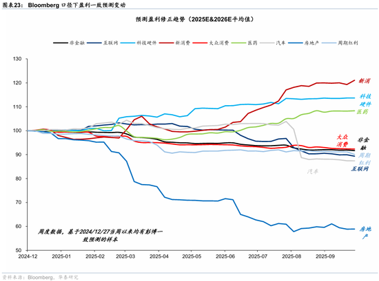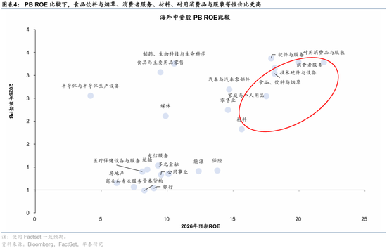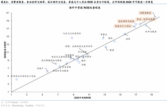 ROE回升视角下,消费者服务、食品饮料与烟草、技术硬件与设备、家庭与个人用品2025~2026年ROE本身水平较高,且市场预期2026年可能进一步修复。如果仅看修复程度,汽车与零部件、半导体、零售、医疗保健、技术硬件与设备修复程度较高。若同时考虑在高ROE水平上再度上升,则耐用消费品与服装、科技硬件具有明显优势。