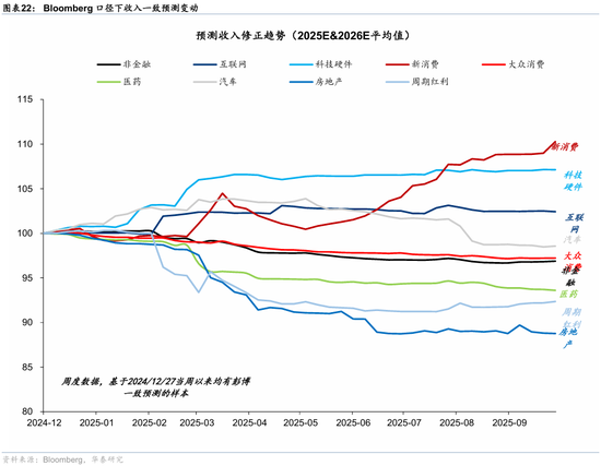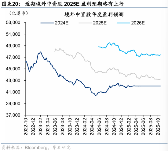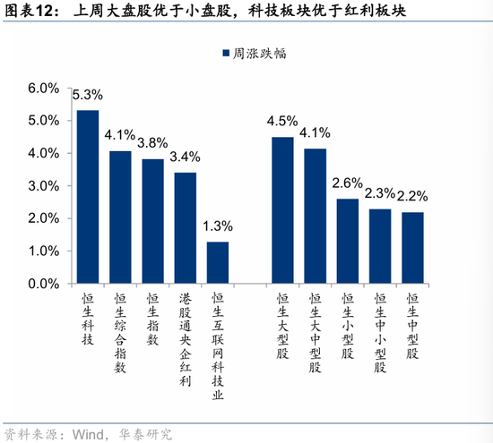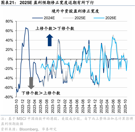 盈利及营收预期修正视角下,根据彭博一致预期,1)营收方面,近一月境外中资股整体/非金融上修0.3%/0.2%,新消费(+1.3%)、金融红利(+0.7%)、周期红利(+0.6%)上修居前,科技硬件、大众消费等略有上修;2)盈利层面,近一月境外中资股整体/非金融变动分别为0.0%/-0.4%,金融其他(主要为非银,+1.4%)、新消费(+0.9%)、医药(+0.5%)上修居前,互联网(-1.4%)、地产(-1.2%)下修较多。