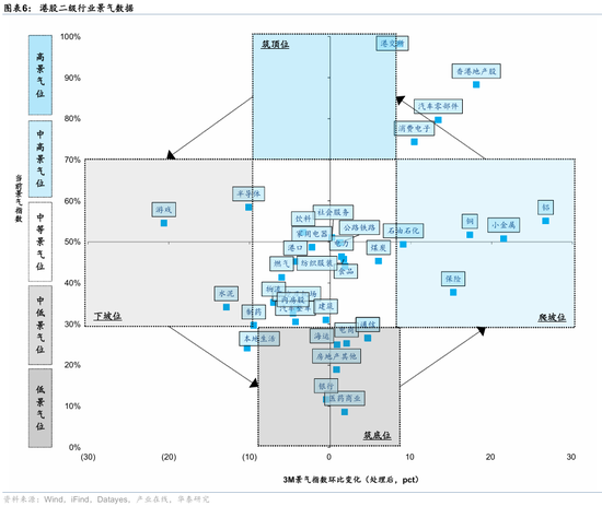 从港股中观景气数据库看,1)景气保持中高位且依然增长:全球流动性宽松和涨价预期的周期方向如金属、材料、能源等;AI产业景气上行的消费电子;兼具高股息和ROE高位,且顺应香港本地经济改善的香港地产和港交所景气仍上行。2)景气处于中低位,但近期已经磨底或开始回升:大众消费中纺服、食品、社服等边际回暖;以及高股息中银行、通信及公用事业等。