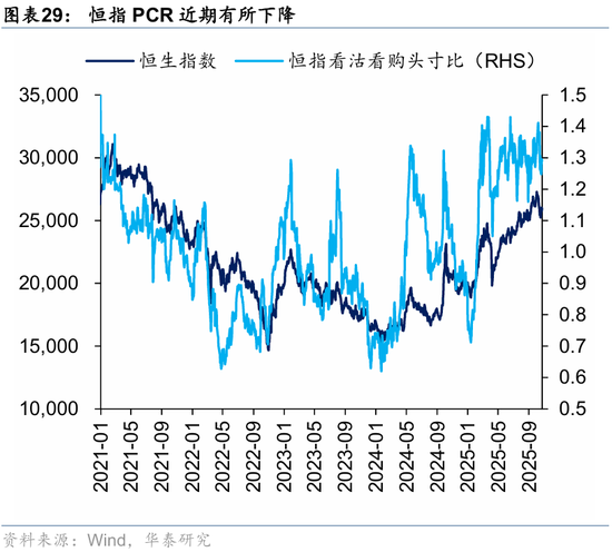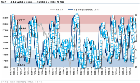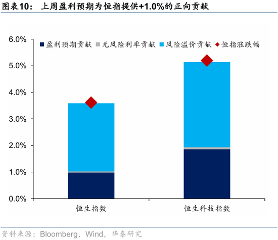 情绪指标已经回归中性区间。华泰港股情绪指标上周五回落至51.7的中性水平,南向情绪分项是最近回落的新动能。该指标位置意味着上下风险较为均衡,风偏较高投资者可逐步建仓,但胜率更优的大幅加仓时机或仍需等待。