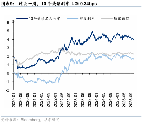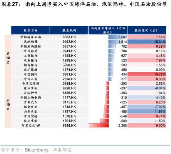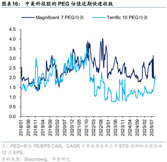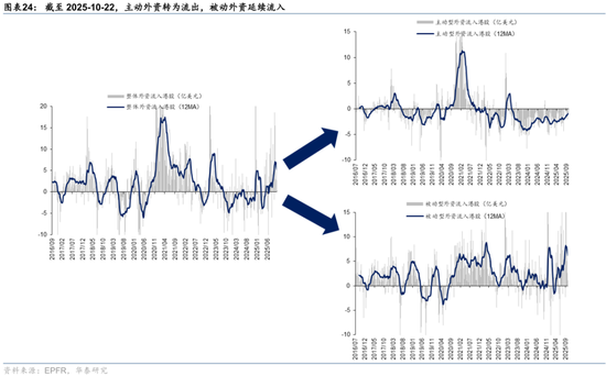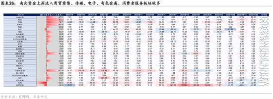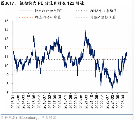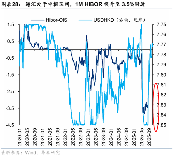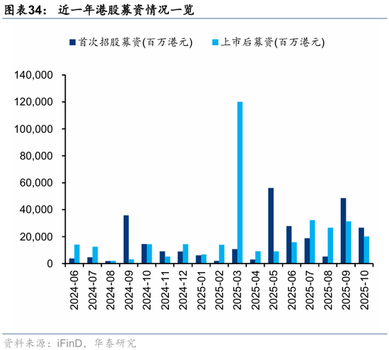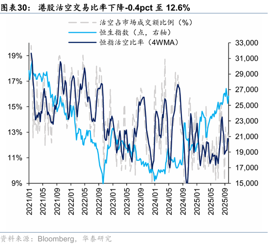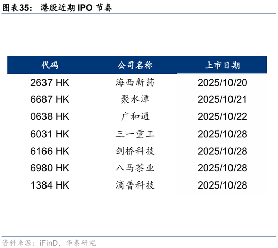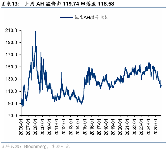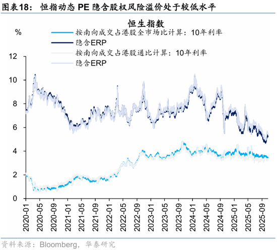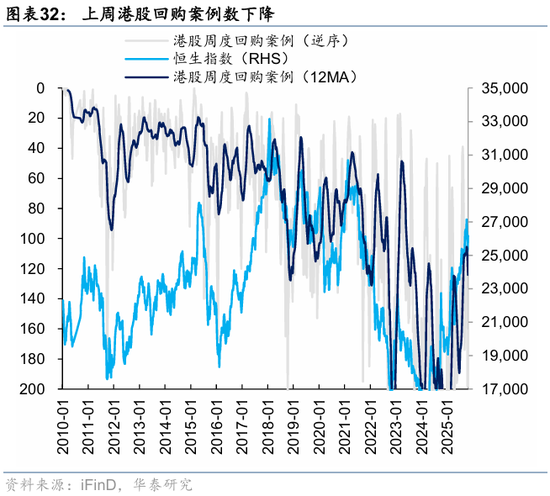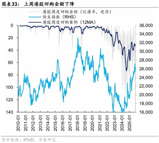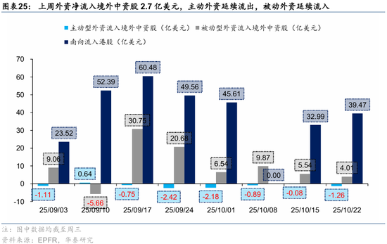 资金观望情绪依然浓厚。截至周三,EPFR口径下外资上周净买入港股1.2亿美元,相较于前一周6.3亿美元有所回落;上周南向净买入港股172.8亿港币,较前一周450.9亿港币的净买入回落。此前,我们测算的下半年南向对港股资金增量约5700亿港币(《香港资产重估进入新阶段》,2025.7.23),年中至今已流入超5000亿港币,年底前获利了结压力或使得南向资金高速流入阶段接近尾声。