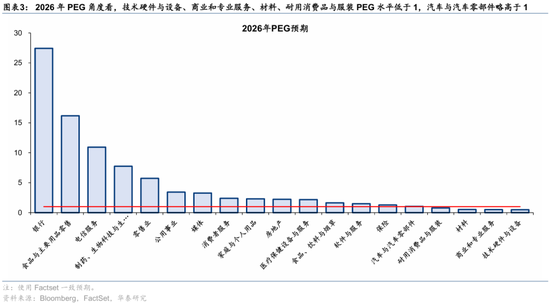 景气改善的同时考虑估值水平,技术硬件与设备、耐用消费品与服装、材料等具有性价比。从2026年预期PEG角度看,技术硬件与设备、商业和专业服务、材料、耐用消费品与服装PEG水平低于1,软件与服务、保险略高于1。PB ROE比较下,食品饮料与烟草、消费者服务、材料、耐用消费品与服装等性价比更高。